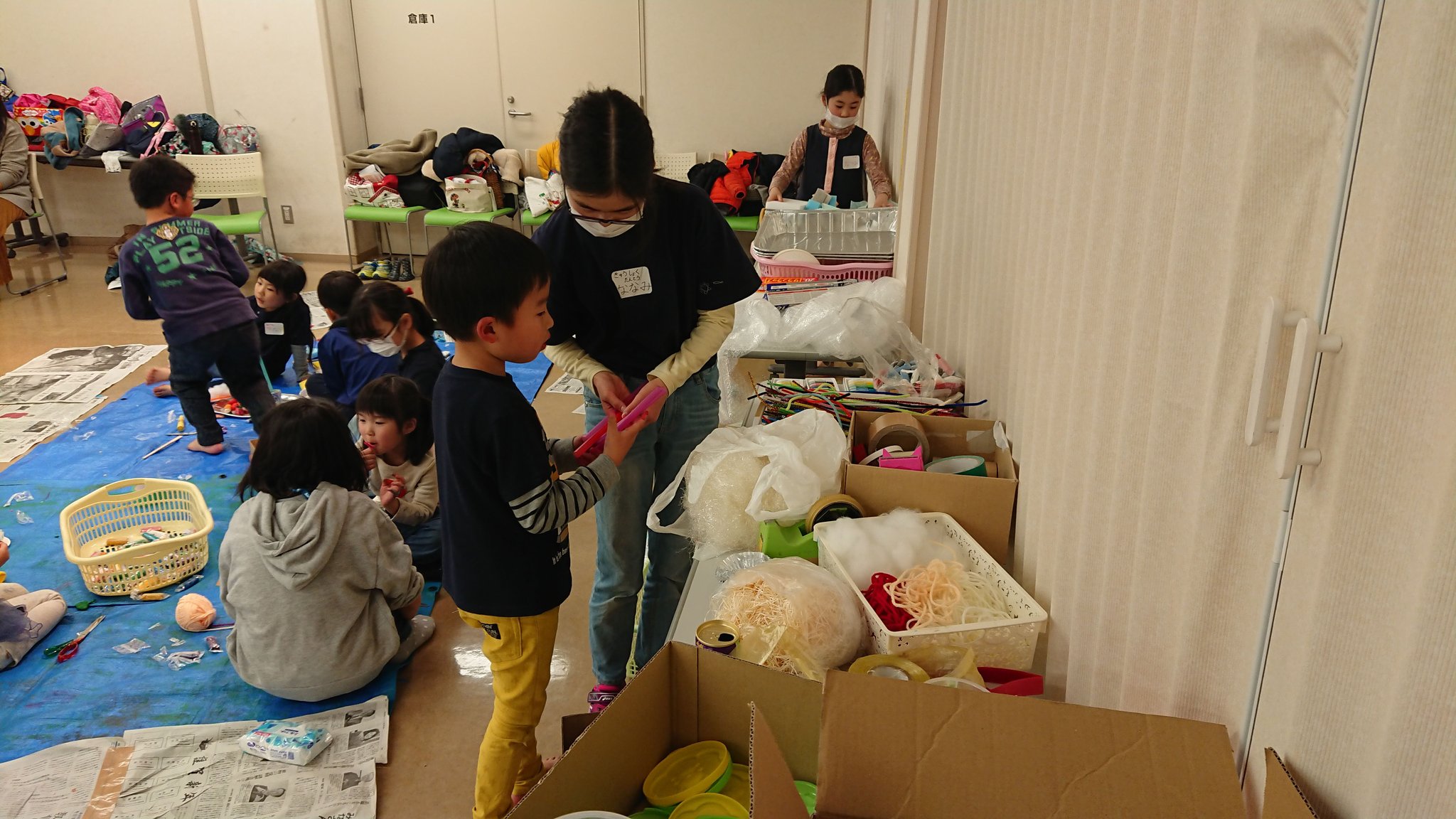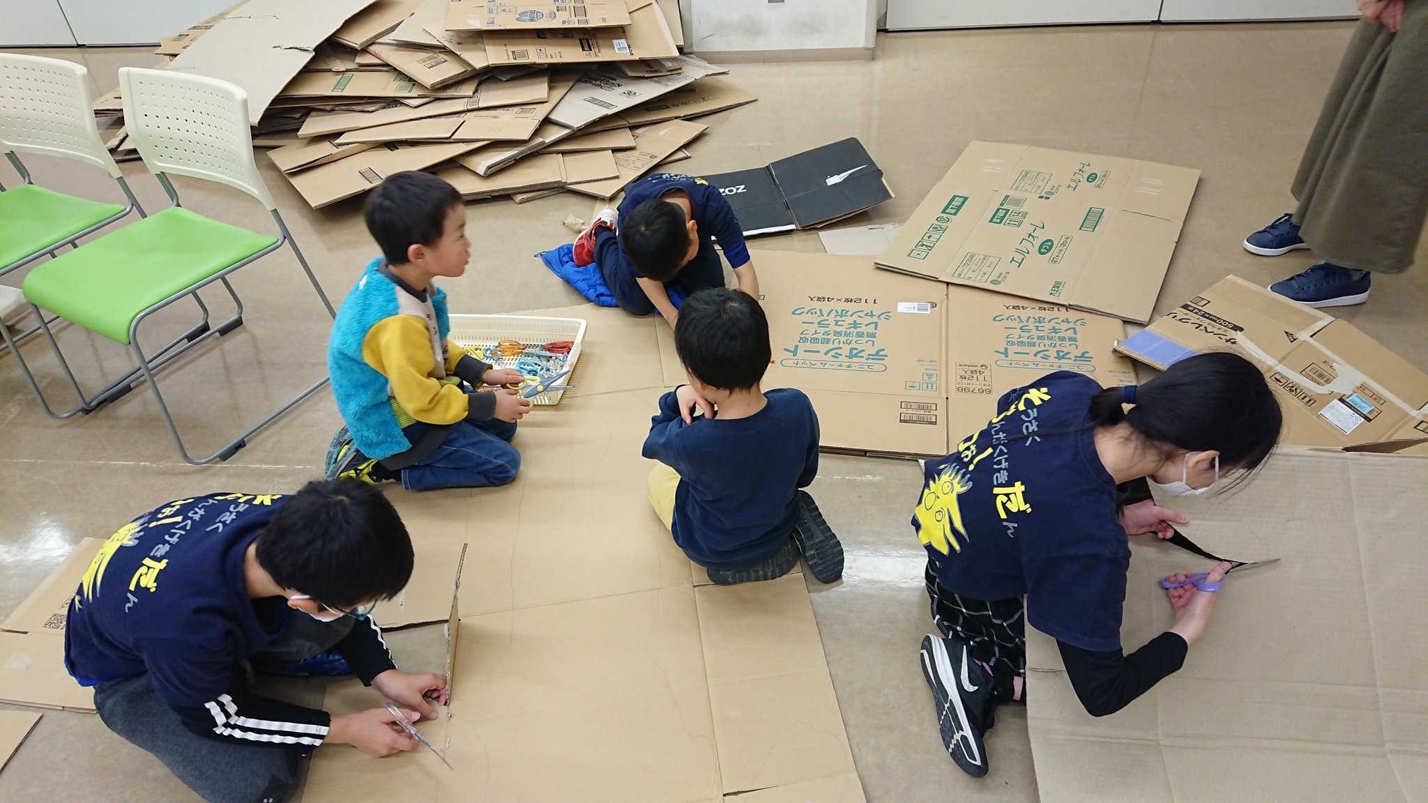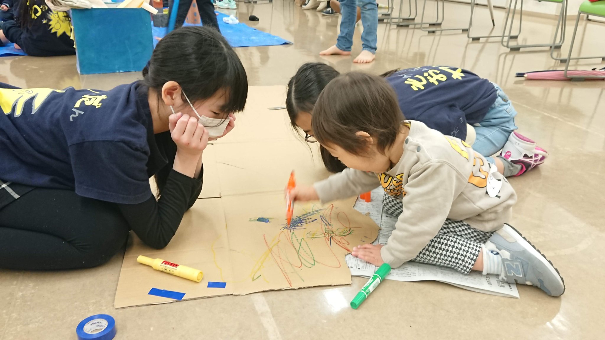 班ごとに、「なに、つくりたい?」「絵の具塗ってみる?」「ダンボールもあるよ!」