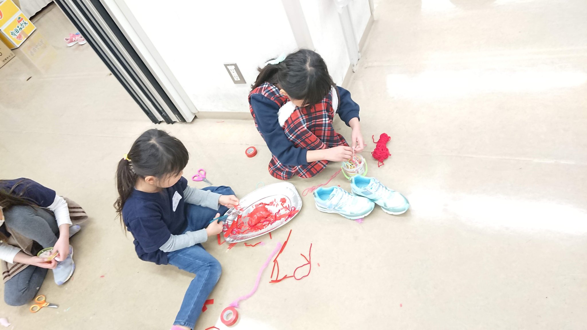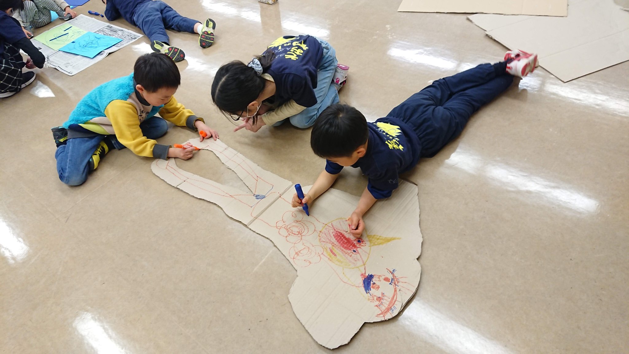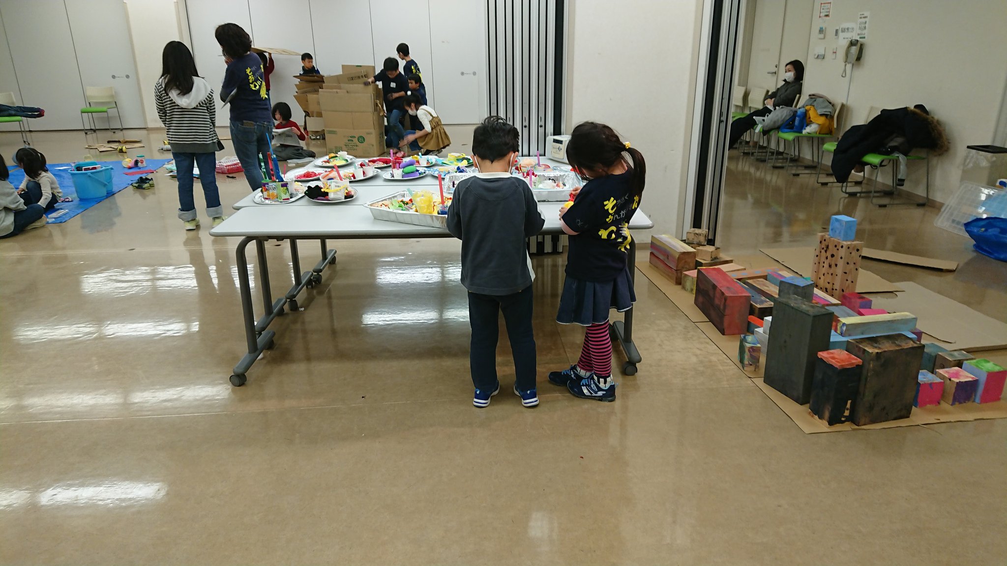 班ごとに、「なに、つくりたい?」「絵の具塗ってみる?」「ダンボールもあるよ!」