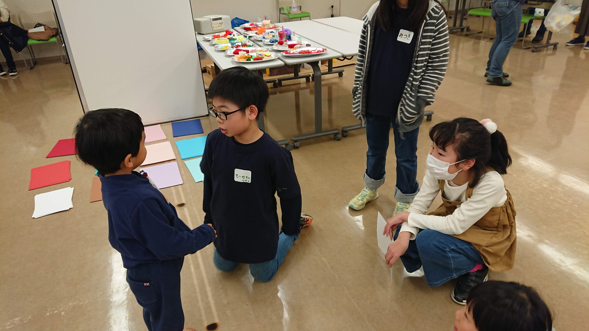 わぉ!メンバーは、それぞれ班で名札をつくり、自分の班のお友だちが来るのを今か今かと待ち構えてます。