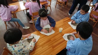 陶芸体験をするのは年長さん。お部屋にて準備を始めると子どもたちが「なにするの?」「とうげい、たのしみ!」と元気いっぱいに声をかけてくれます。
