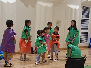 3つのチームにわかれて、それぞれの場面を表現しました。できるだけ、道具をつくらずに、自分たちの身体を使って表現!ということを目標。衣装はできたもののそこからの表現がなかなか広がらず、頭を抱えた班。今回は衣装もつくらない!と決め、常にグループ内で話し合いをしていた班。小さい子が多く、異年齢で取り組むことの難しさに奮闘していた班。とさまざまな課題がありましたが、全員で完成した劇を見ていると、各班のカラーが存分に出ていて、とてもおもしろい劇となりました。