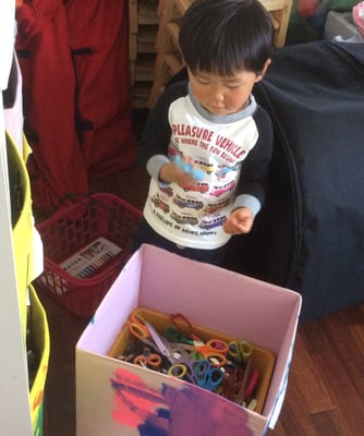 3歳なりたてのAくんですが、必要な材料や道具、使いたいはさみやテープの種類まで、Aくんは自分で選びます。画用紙の色や廃材の種類も。