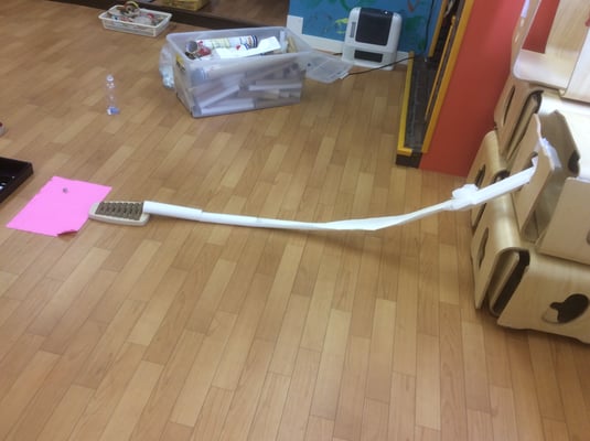スタッフと一緒に、いろいろなものを創ってきたAくん。一か月でどんな材料でどんなことができるかが、少しずつ分かってきたのです!声をかけなければ、次々に自分で作業を進める日もあります。はさみをじょきじょき、テープをぐるぐるびーっとはりつけ、完成させていきます。らくだぐみはストップがないので、飽きるまでその制作を行います。納得がいくまで作業をできるのが、らくだぐみのよいところ。これを繰り返し、彼の遊びの幅はどんどん広がっていっています。いちから自分が考える遊びは、改良したり、発展させたりしながら、無限に広がっていくのです。