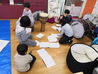 音楽隊は、劇中の効果音さがし。いい音あるかな~。