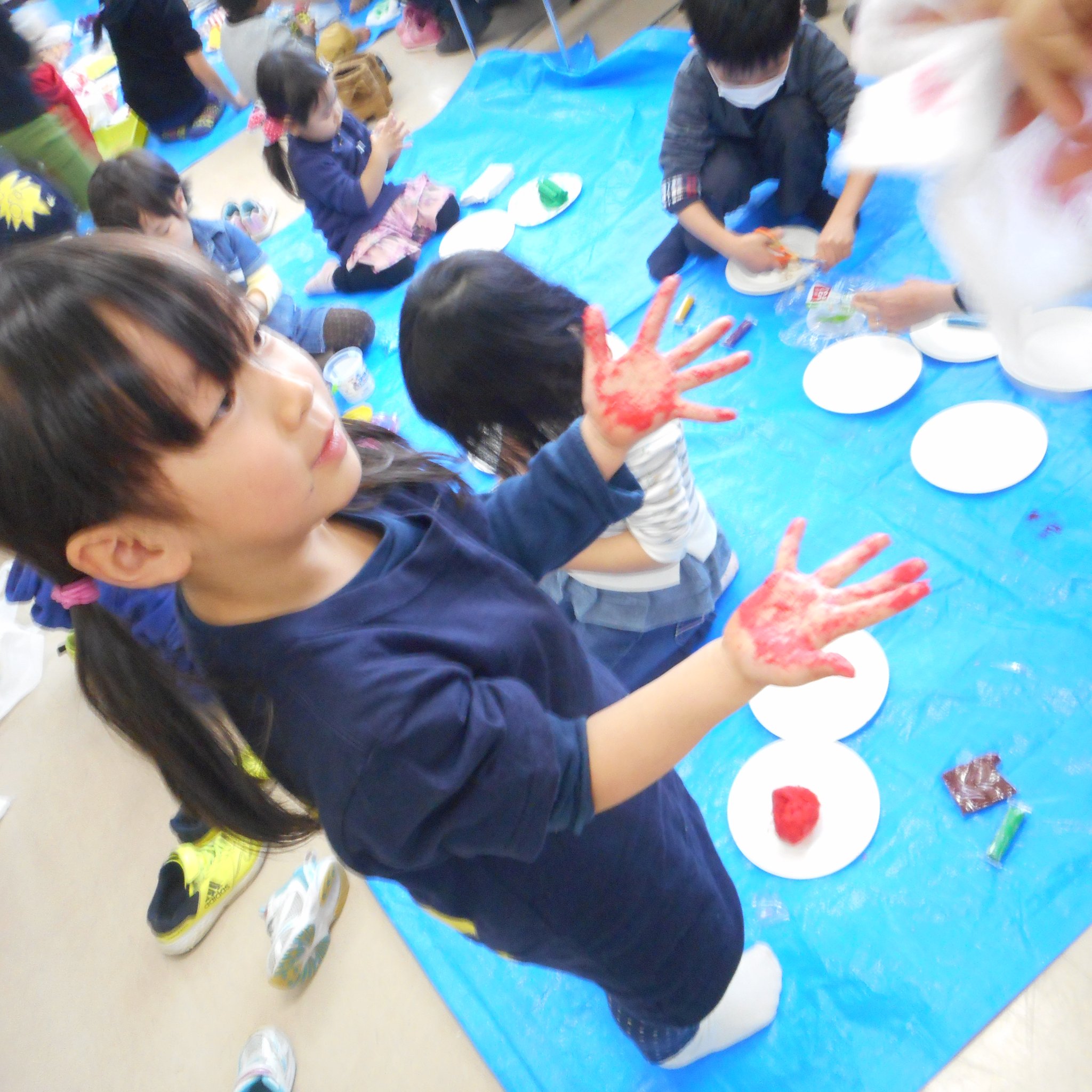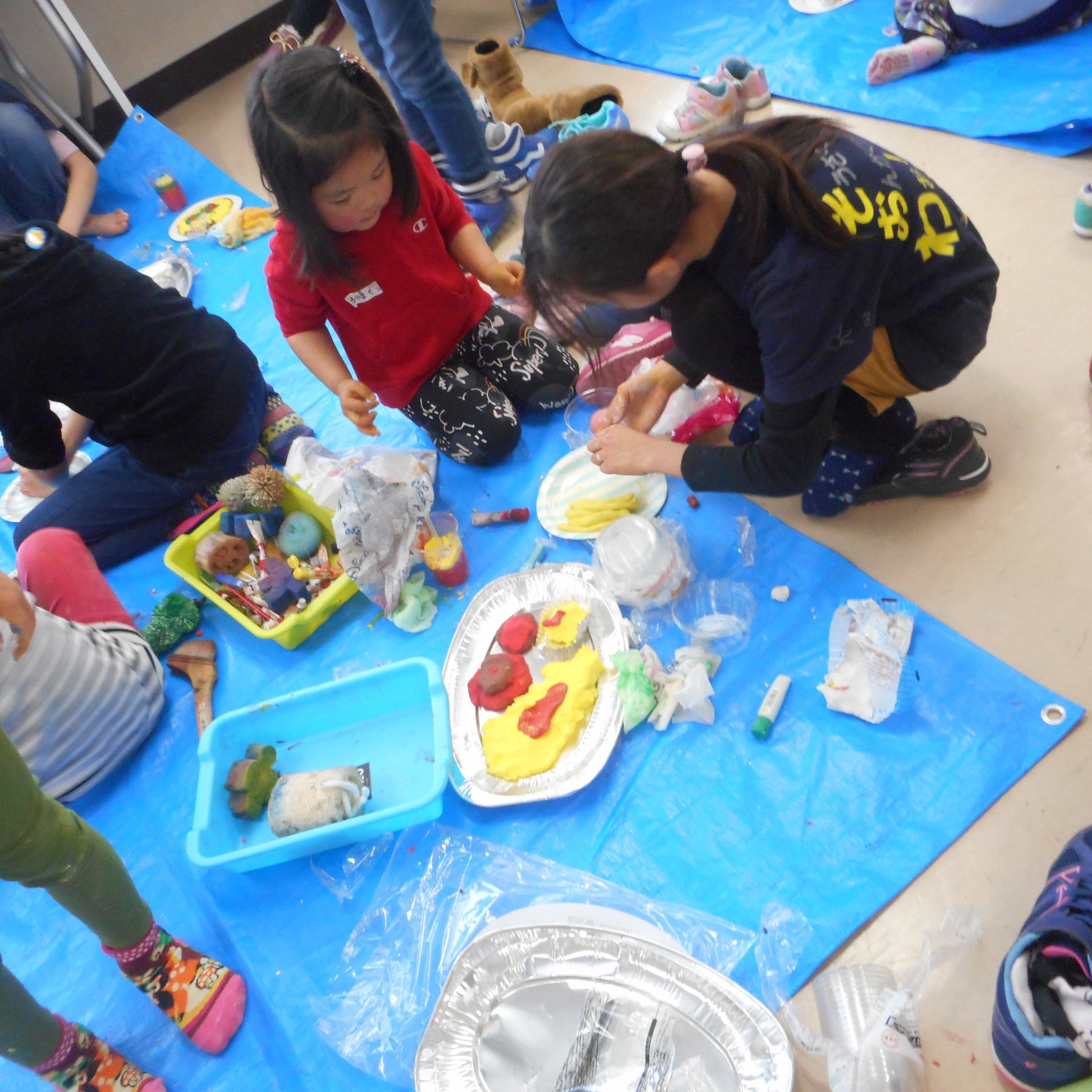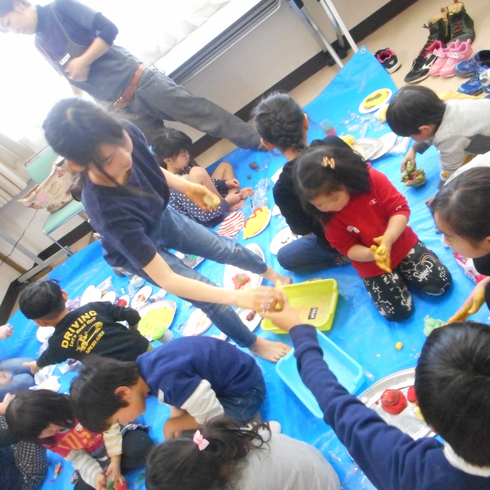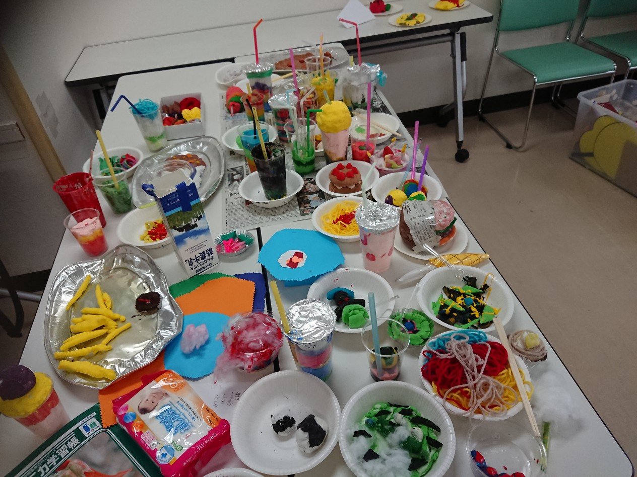 「粘土ある?」「茶色の絵の具持ってる人ー!?」「それ上手!」「ハンバーグ?」「オムライス?」「ケーキ?」