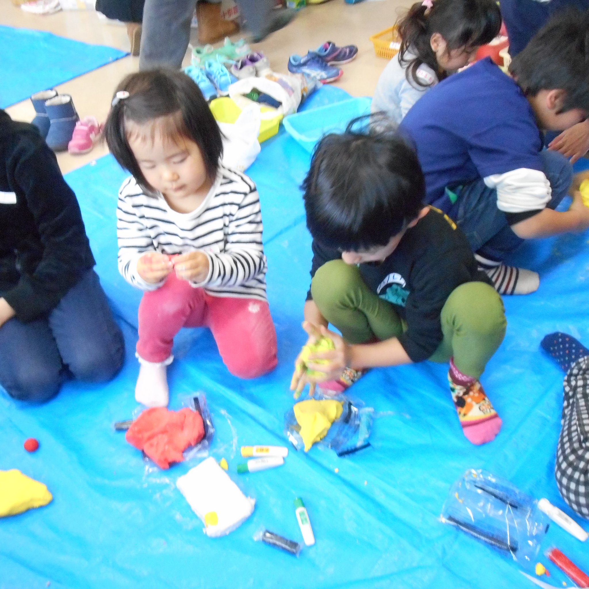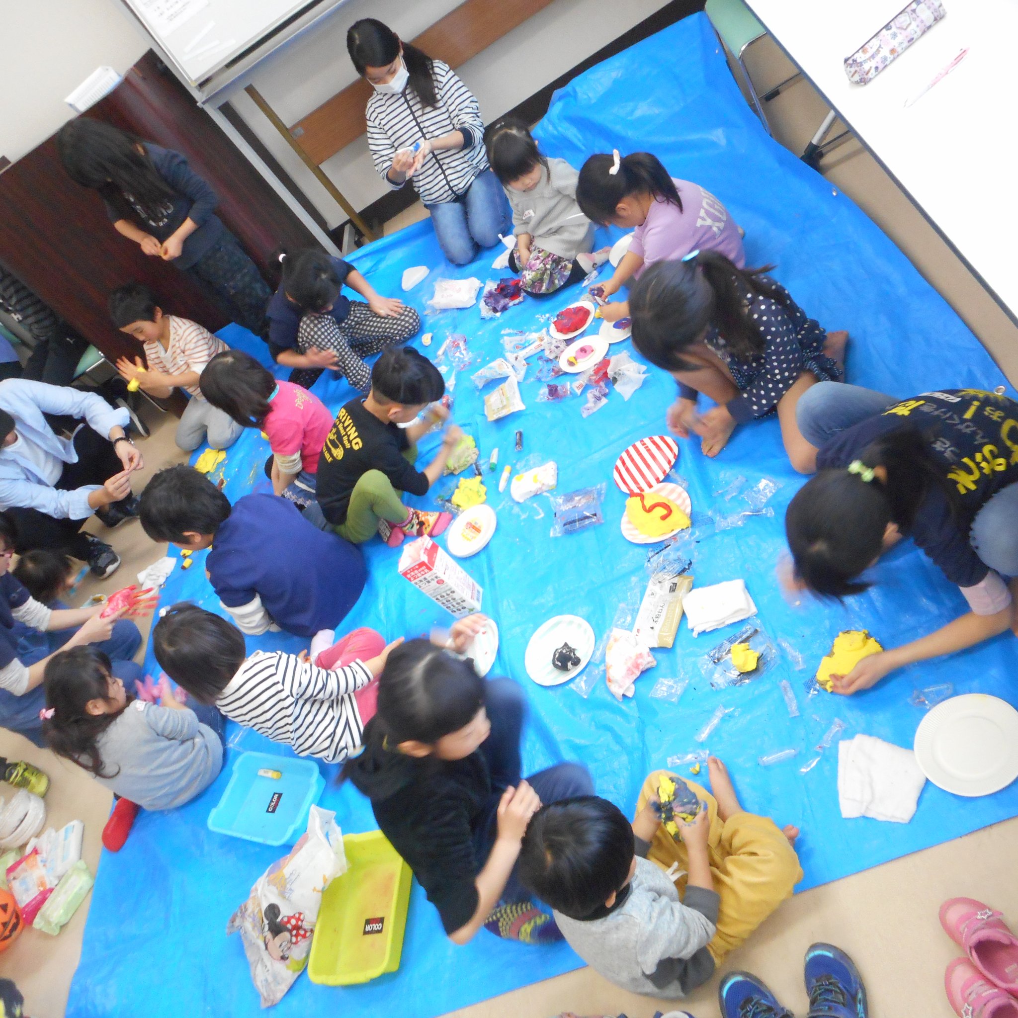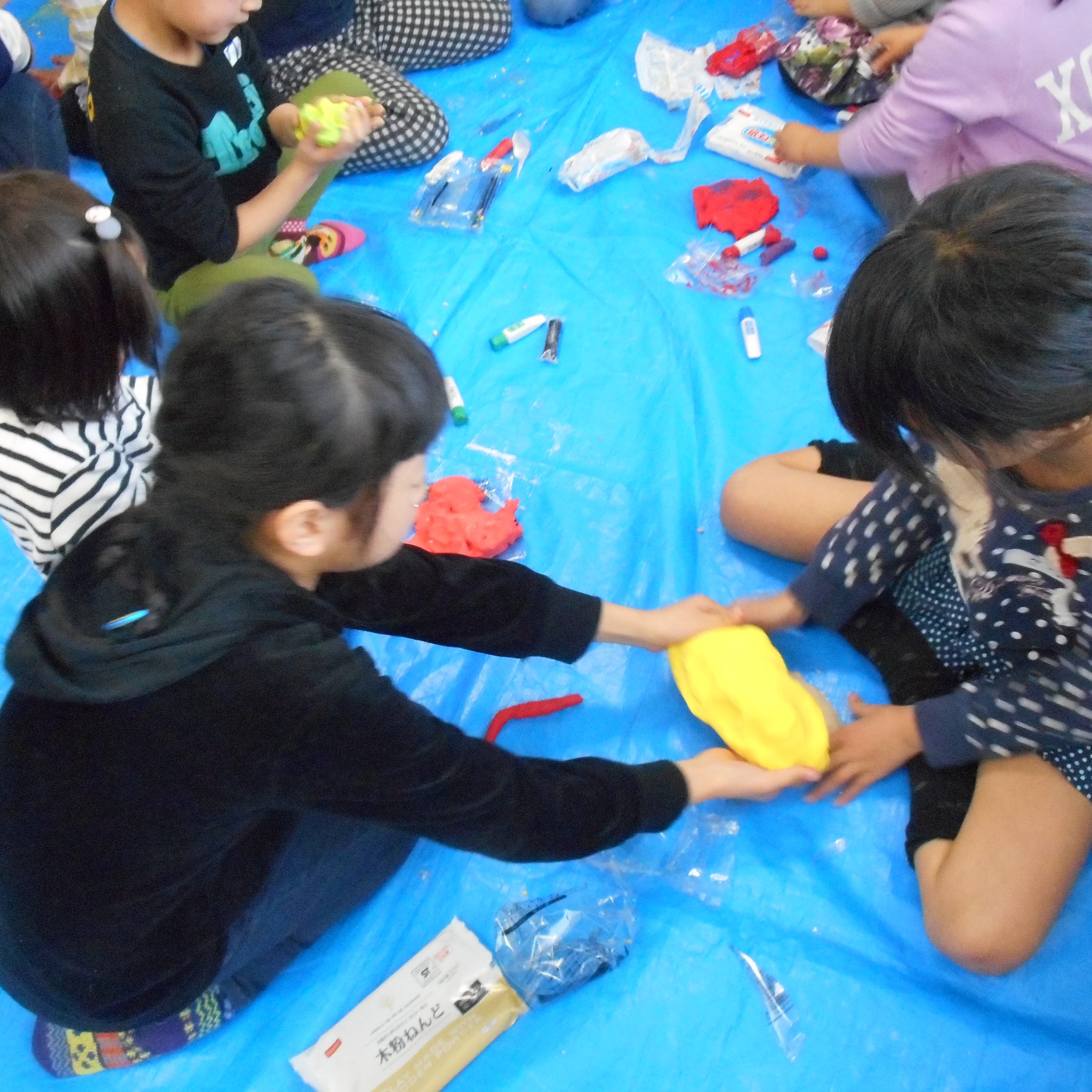 「粘土ある?」「茶色の絵の具持ってる人ー!?」「それ上手!」「ハンバーグ?」「オムライス?」「ケーキ?」