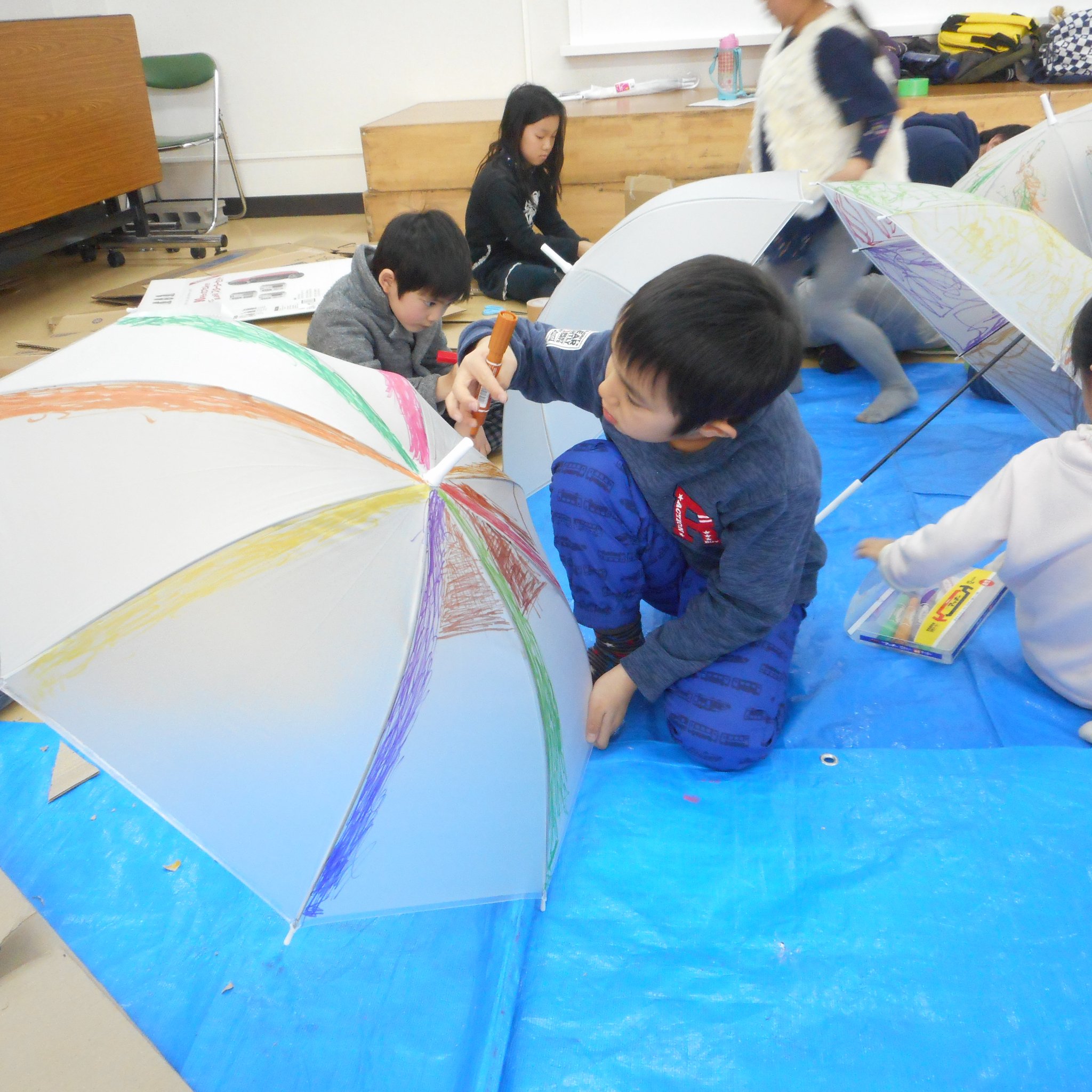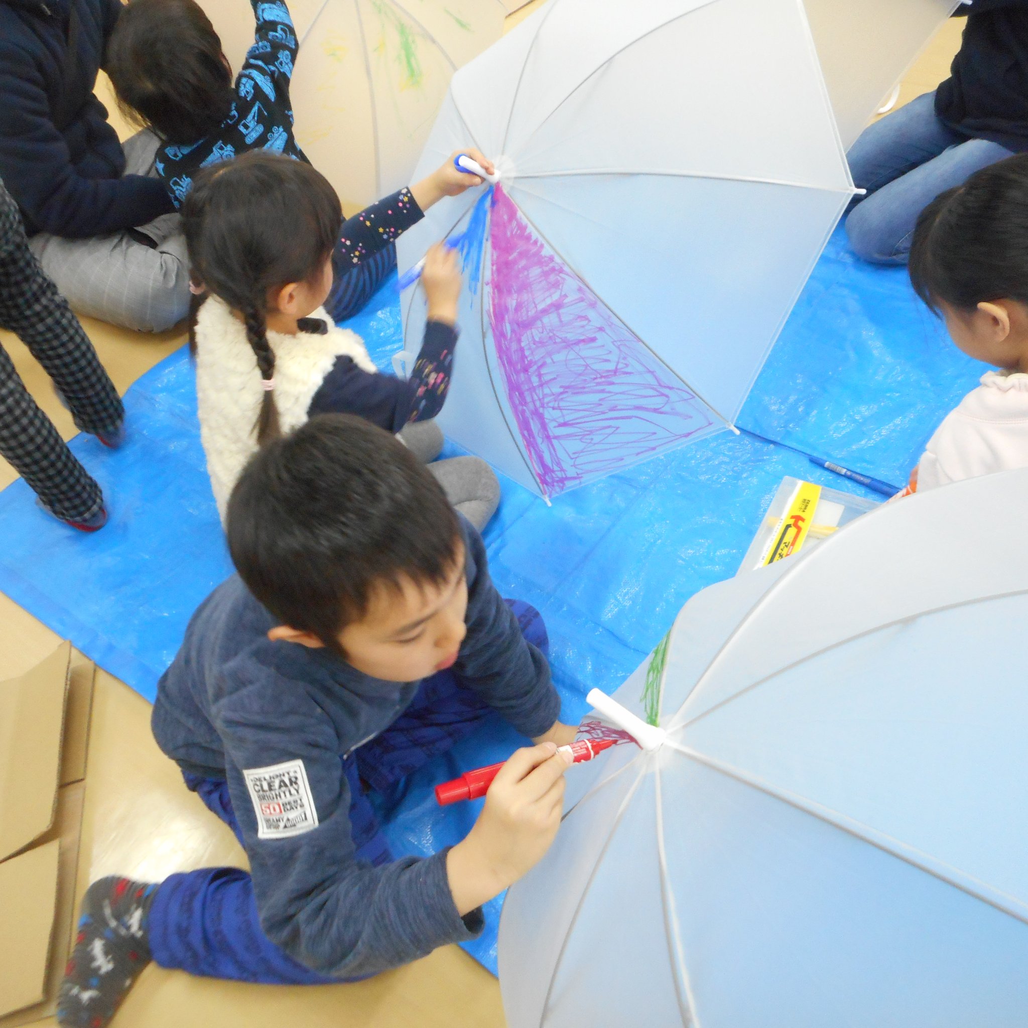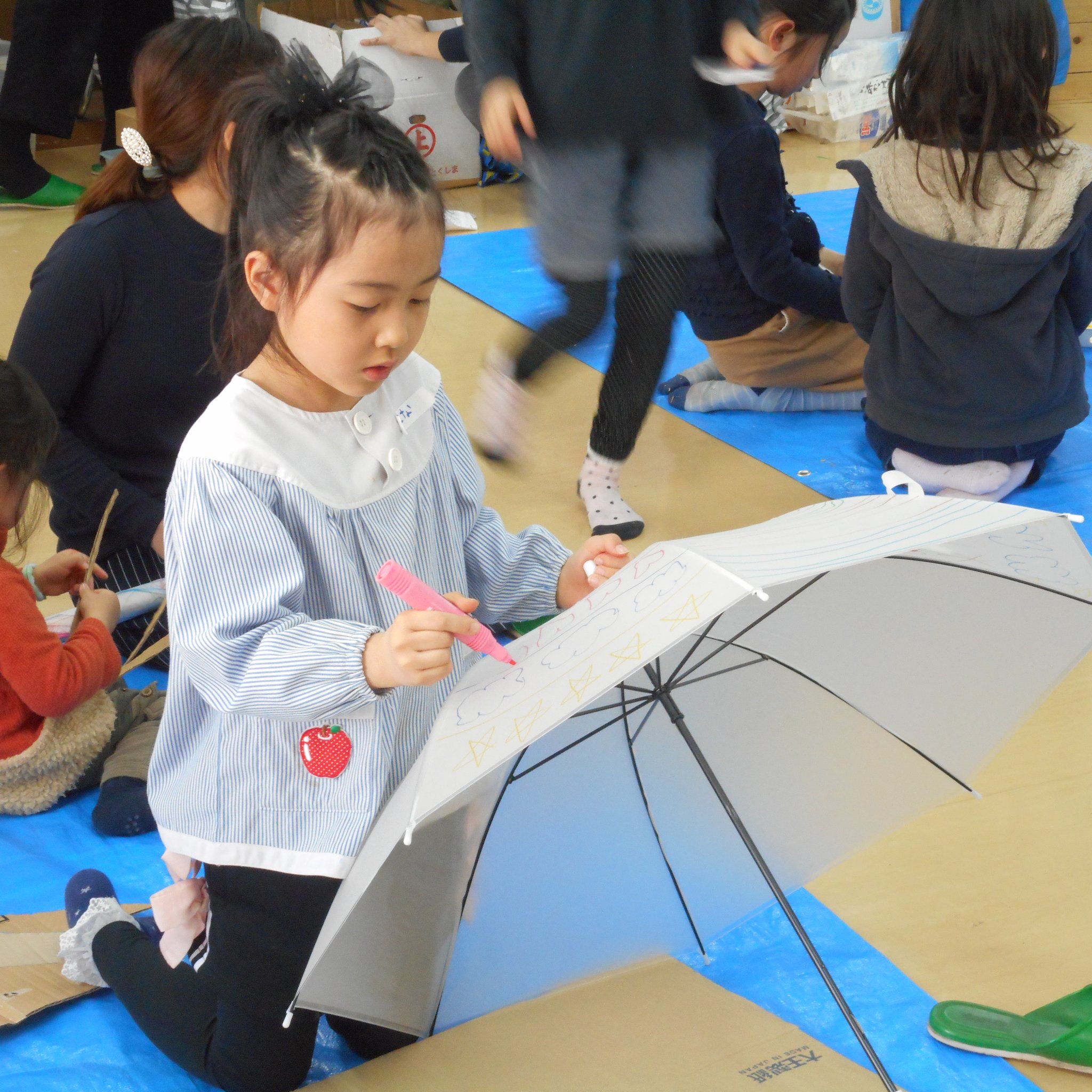 そして、普段、傘に絵を描くなんてしないようなことができる!というのも子どもたちにとっては新鮮だったようで、思い思い傘のキャンバスに描いてくれました。